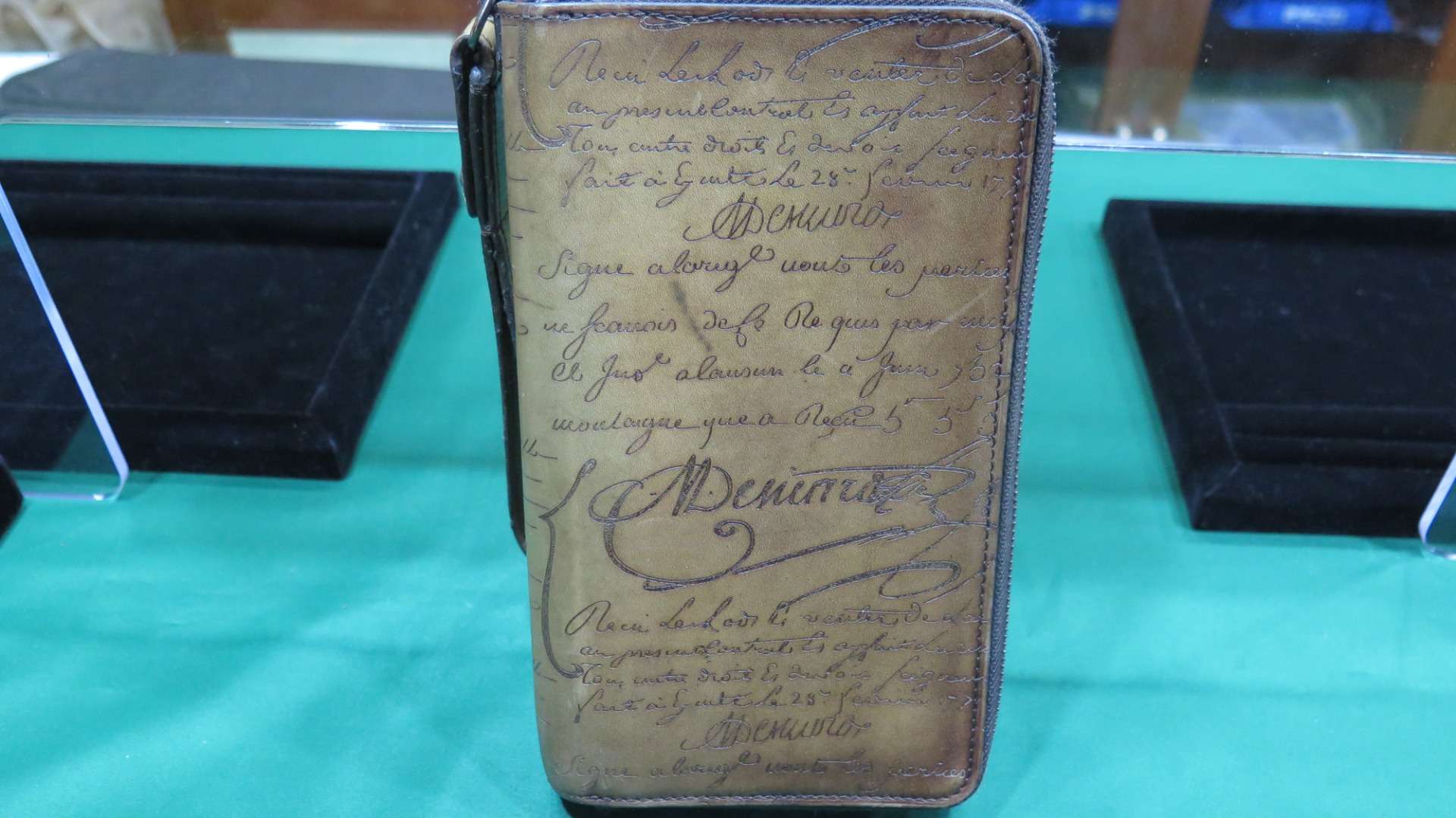 最後にベルルッティの代表作ヴェネツィアレザーの本来の色と、カリグラフィーを全体に表現した、ダブルジッピーウォレットです。