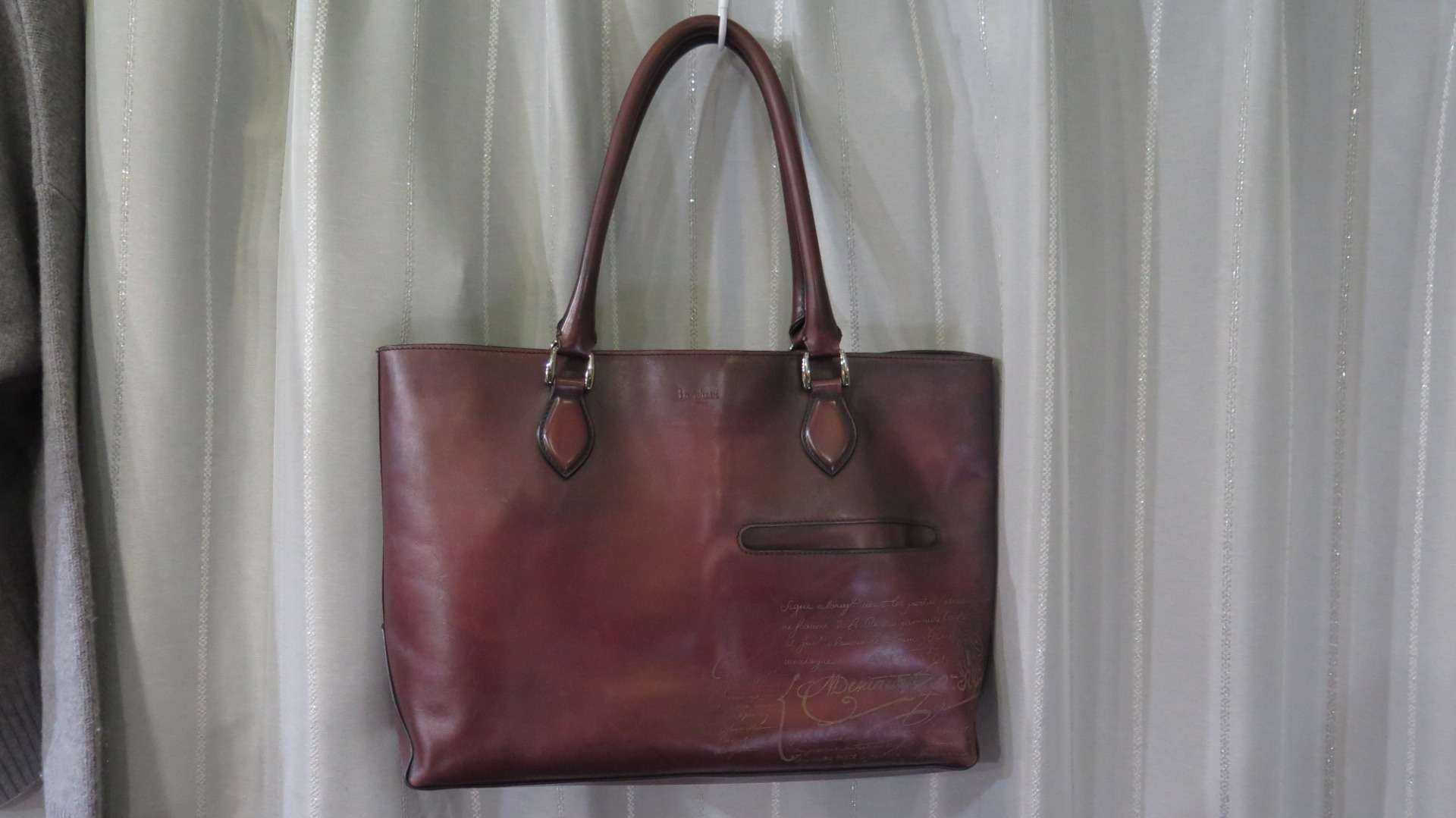 ベルルッティを象徴するヴェネツィアレザー本来のきめ細かな表面を全体で表現しながらカリグラフィーがワンポイントで入っていますので重厚な感じは一切いたしません。